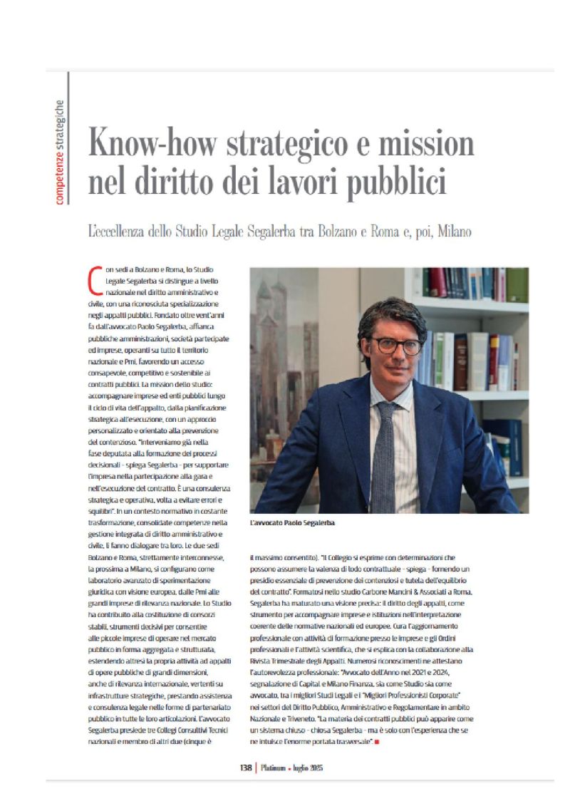 Per l'anno 2021, sia lo Studio Legale Segalerba che, al suo interno, l'Avv. Paolo Segalerba, hanno ricevuto un importante riconoscimento, essendo stati inseriti rispettivamente tra i migliori Studi Legali ed i Migliori Professionisti Corporate nei settori Public Law - Diritto Amministrativo e Regolamentare in ambito Nazionale nella categoria "Selected" e altresì nel Territorio del Triveneto, categoria "Elite".